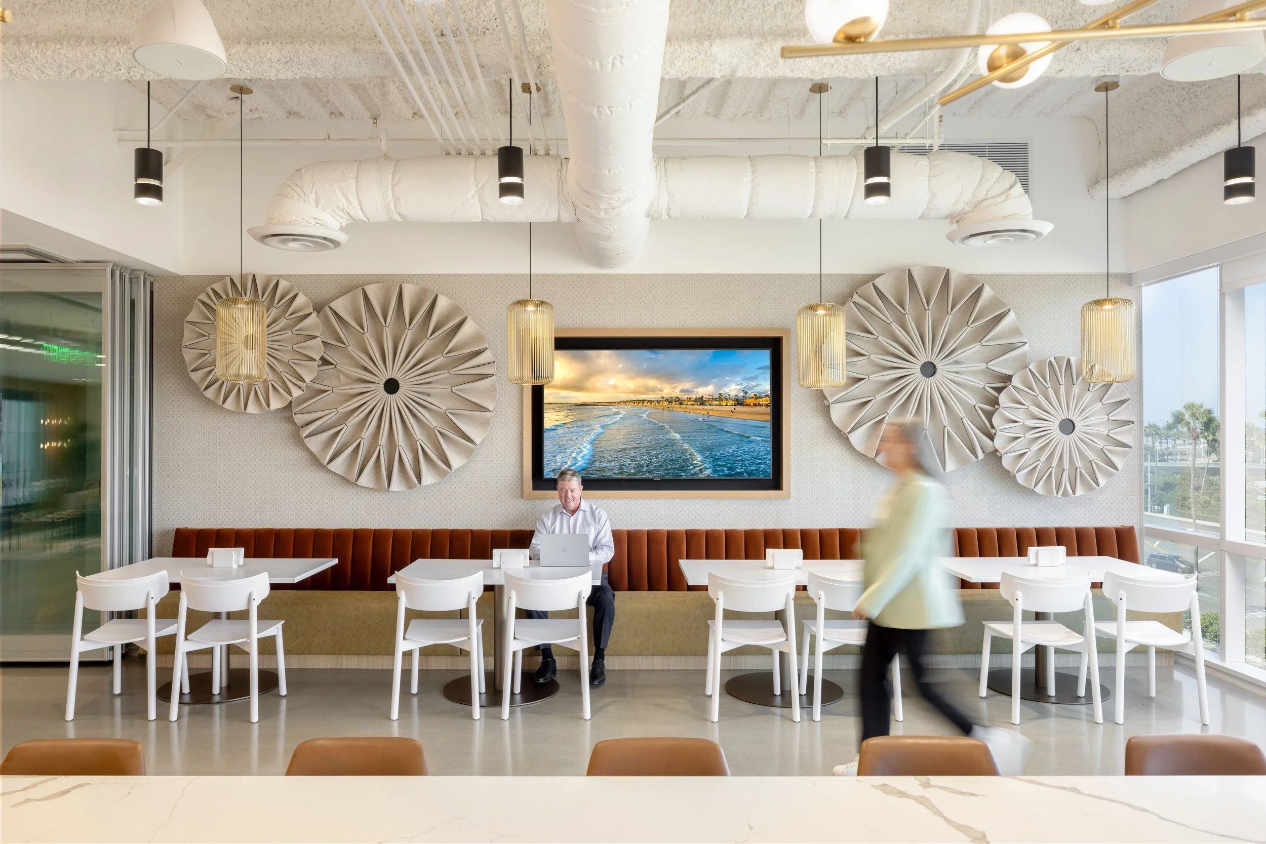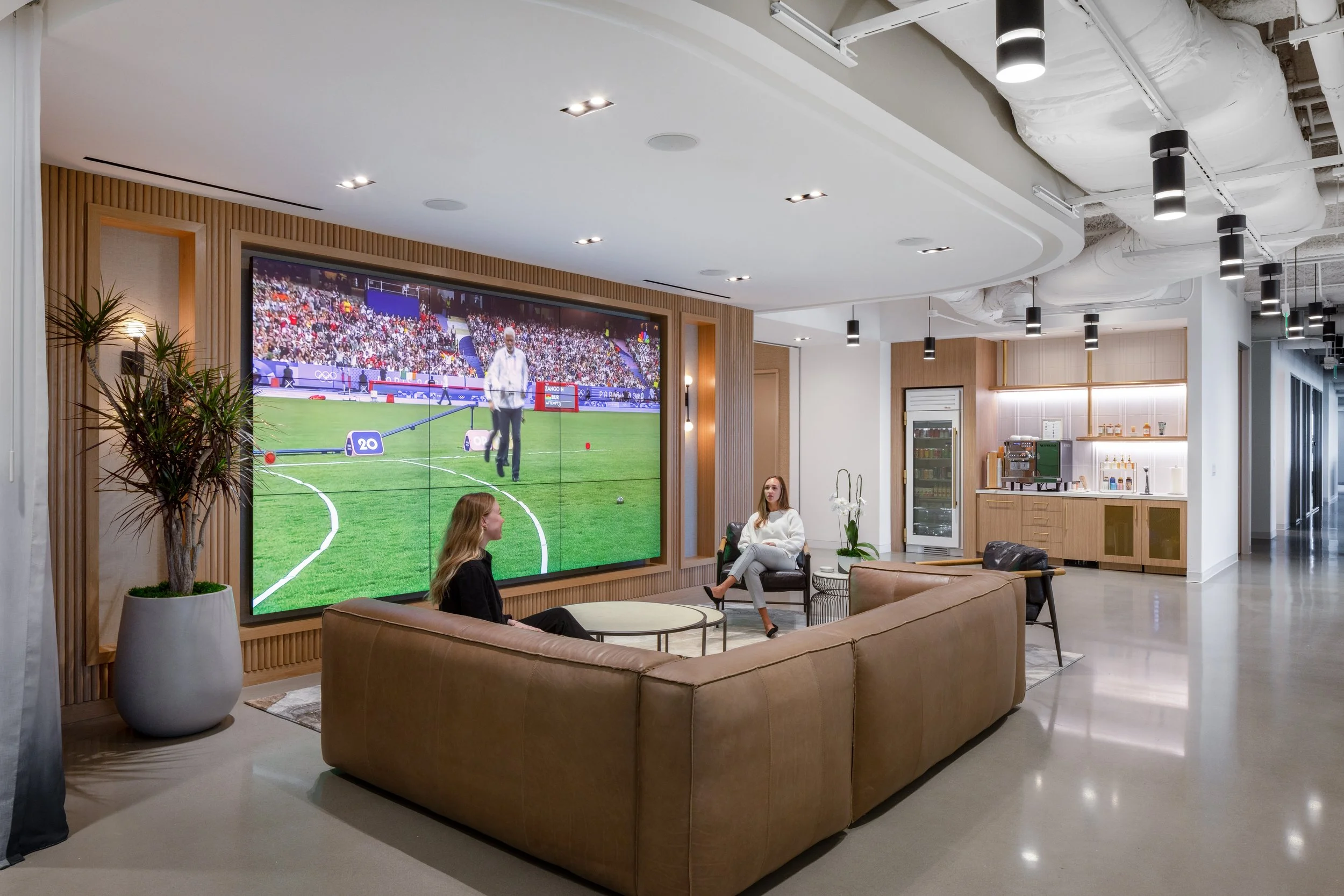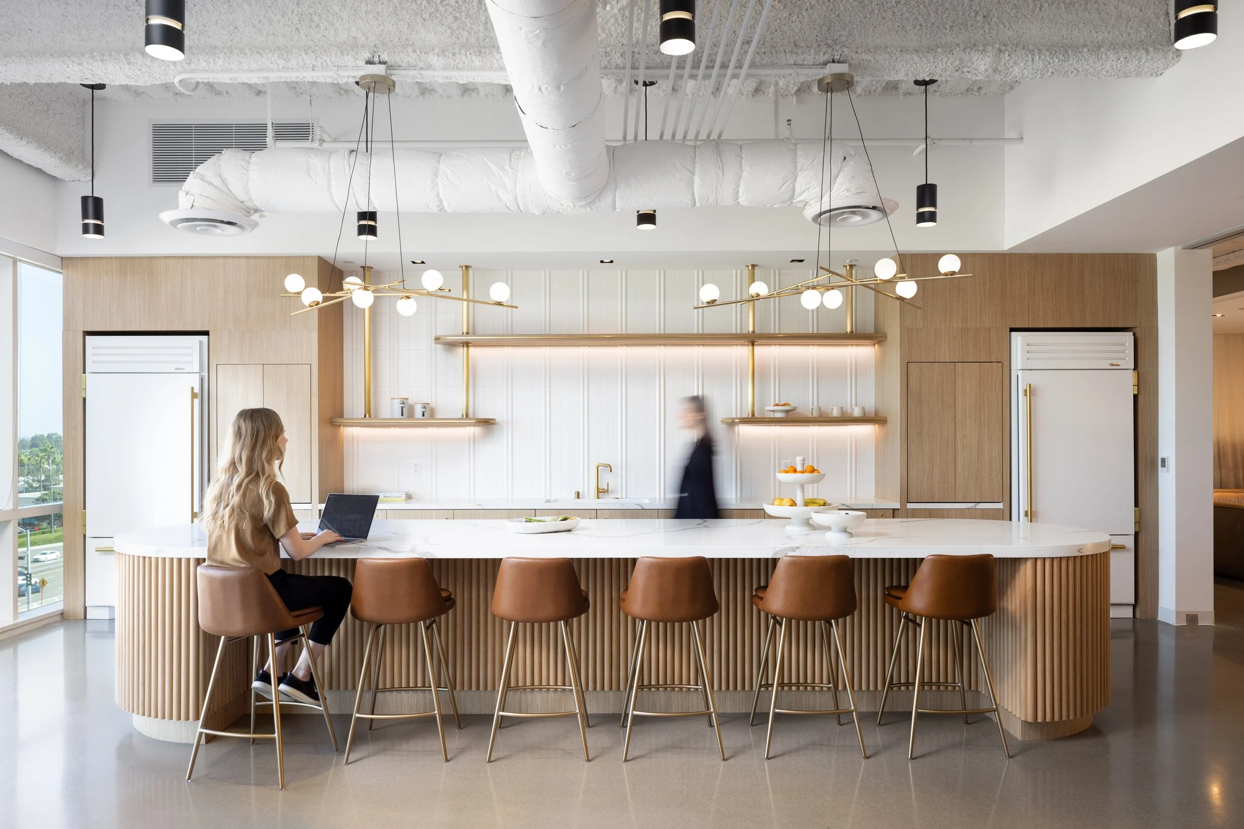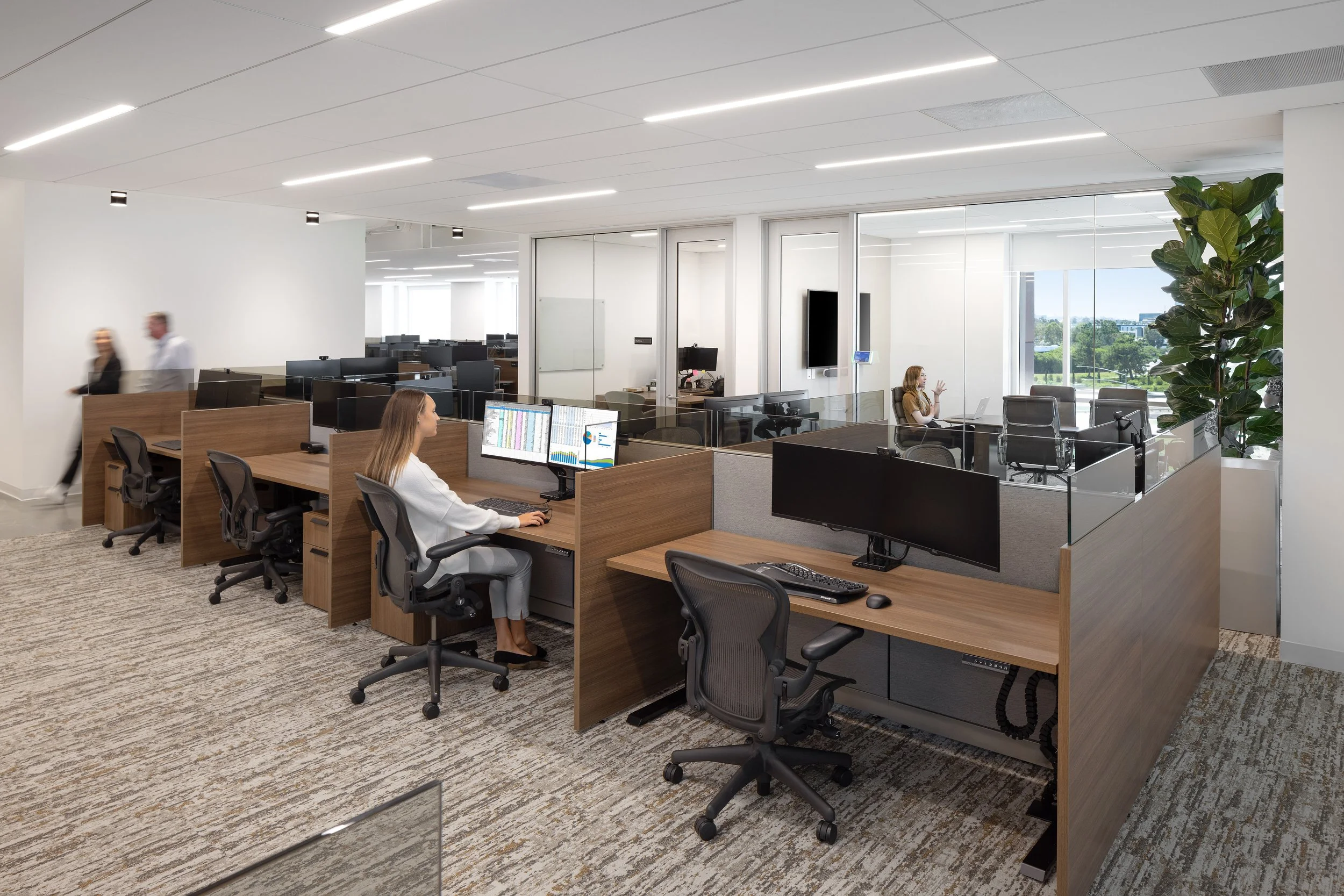 The project included 109 height-adjustable workstations and 34 private offices, a Boardroom, Conference Rooms, Huddle Rooms, Mother’s Room, Breakroom, Lounge areas, and all conference and lounge/multipurpose seating. The large conference table features discreet edge detail drawers for power and connectivity, keeping the surface seamless and clutter free. In the gathering areas, we opted for a more residential style in the furniture selection near the coffee bar and TV space. Also, in collaboration with Hendy, we developed micro-offices utilizing Silea product with cantilevered worksurfaces to maximize space. The space was designed by Hendy to align with the client’s modern brand.